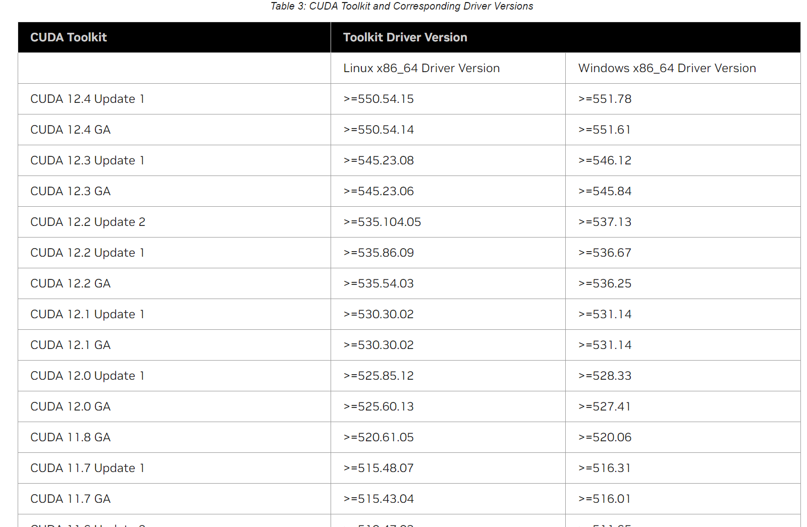 - CUDA 驱动对应: https://docs.nvidia.com/cuda/cuda-toolkit-release-notes/index.html#id6